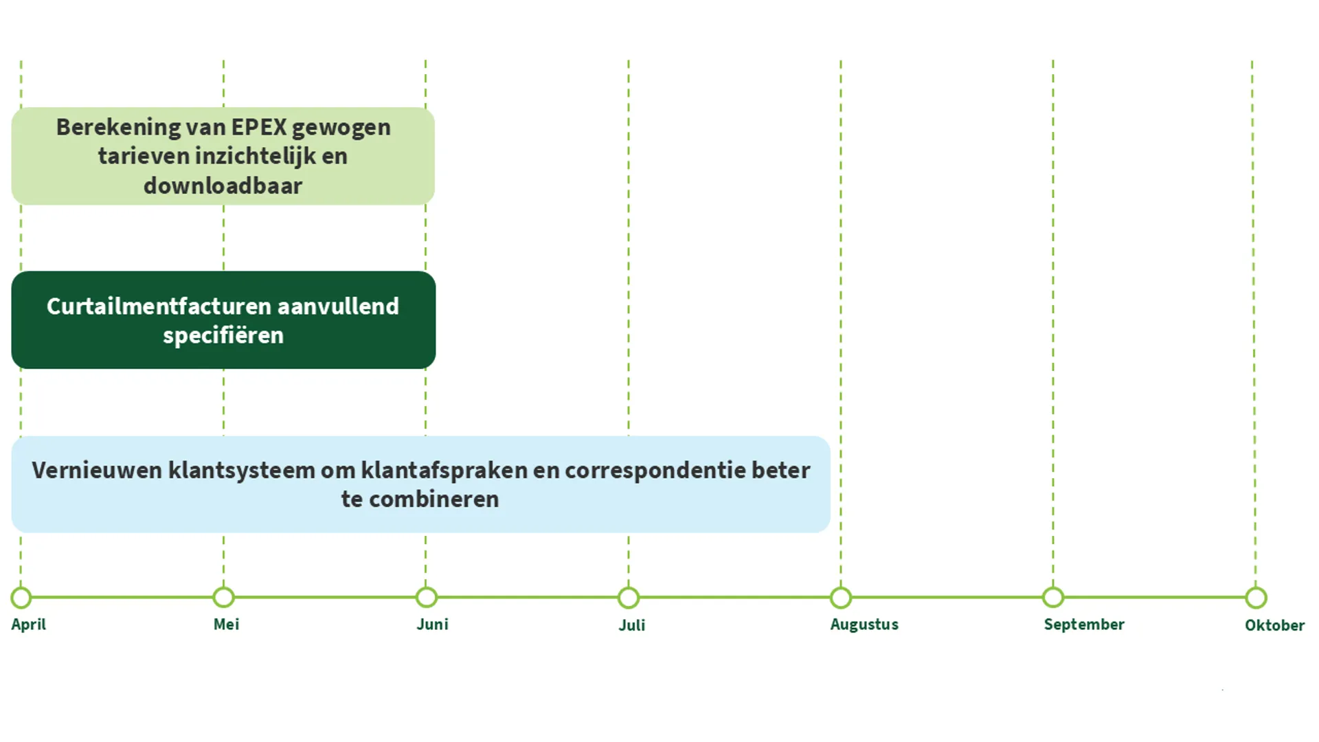 Zo kun je binnenkort de berekening van je EPEX uurgewogen tarief downloaden (indien van toepassing op je contractafspraken), wordt er gewerkt aan meer detaillering op de curtailmentfactuur en zijn wij bezig aan een systeem waarin wij alle contractinformatie en correspondentie op één centrale plek terug kunnen vinden.